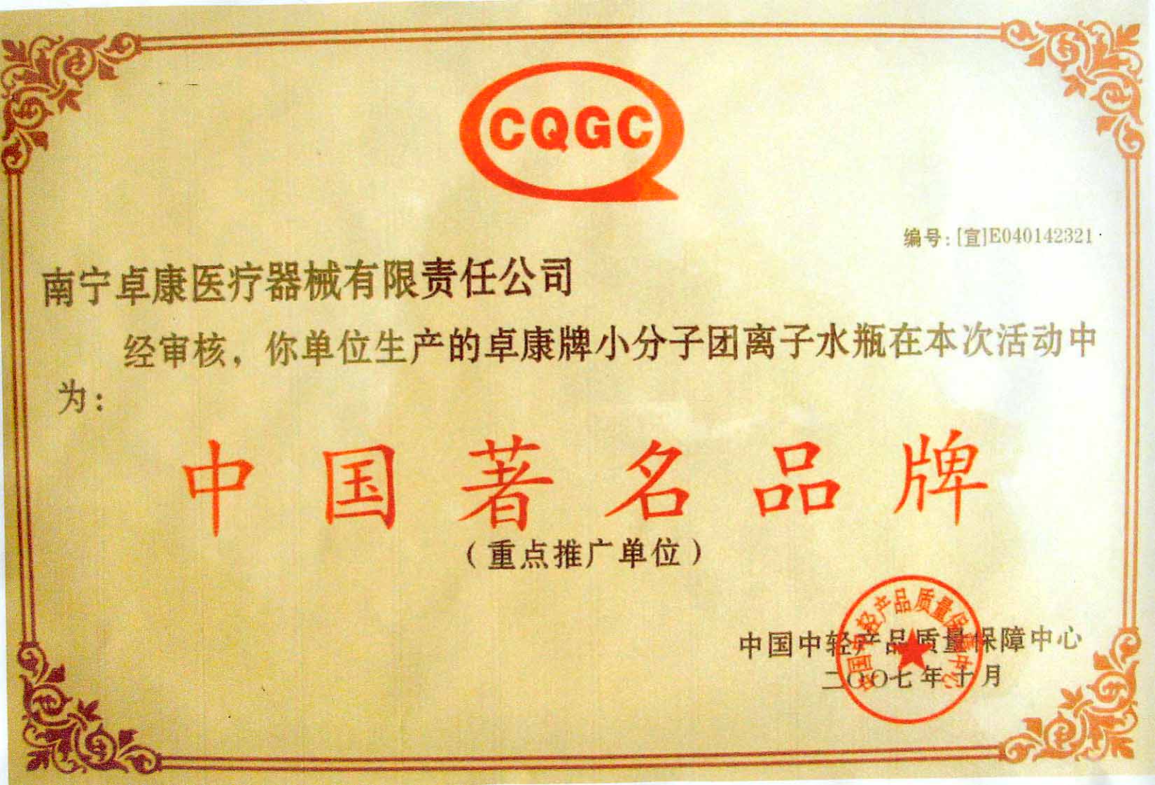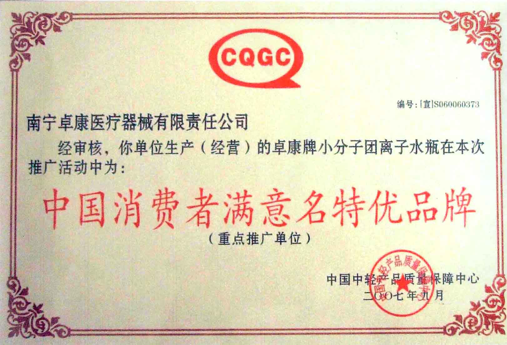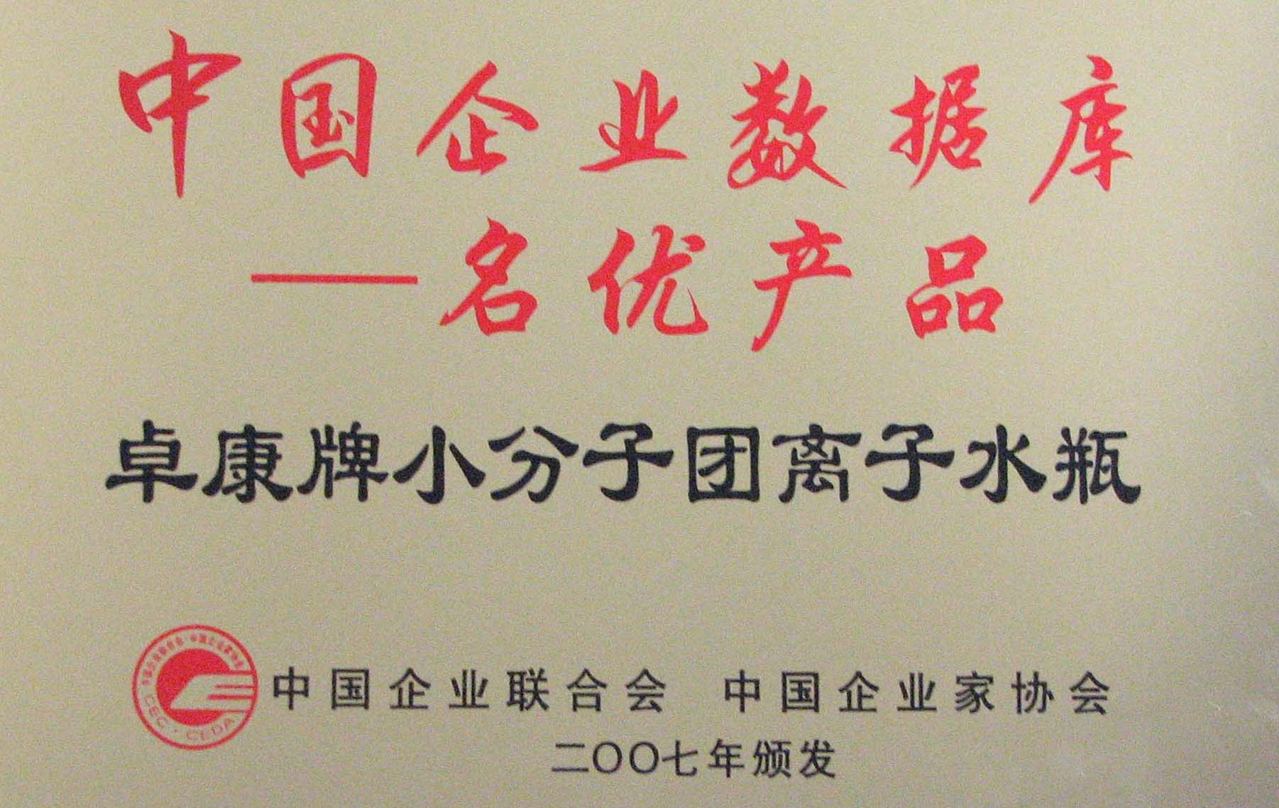 卓康牌離子水瓶榮獲中國企業名優產品[點小圖見大圖]、中國著名品牌稱號[點小圖可見大圖]