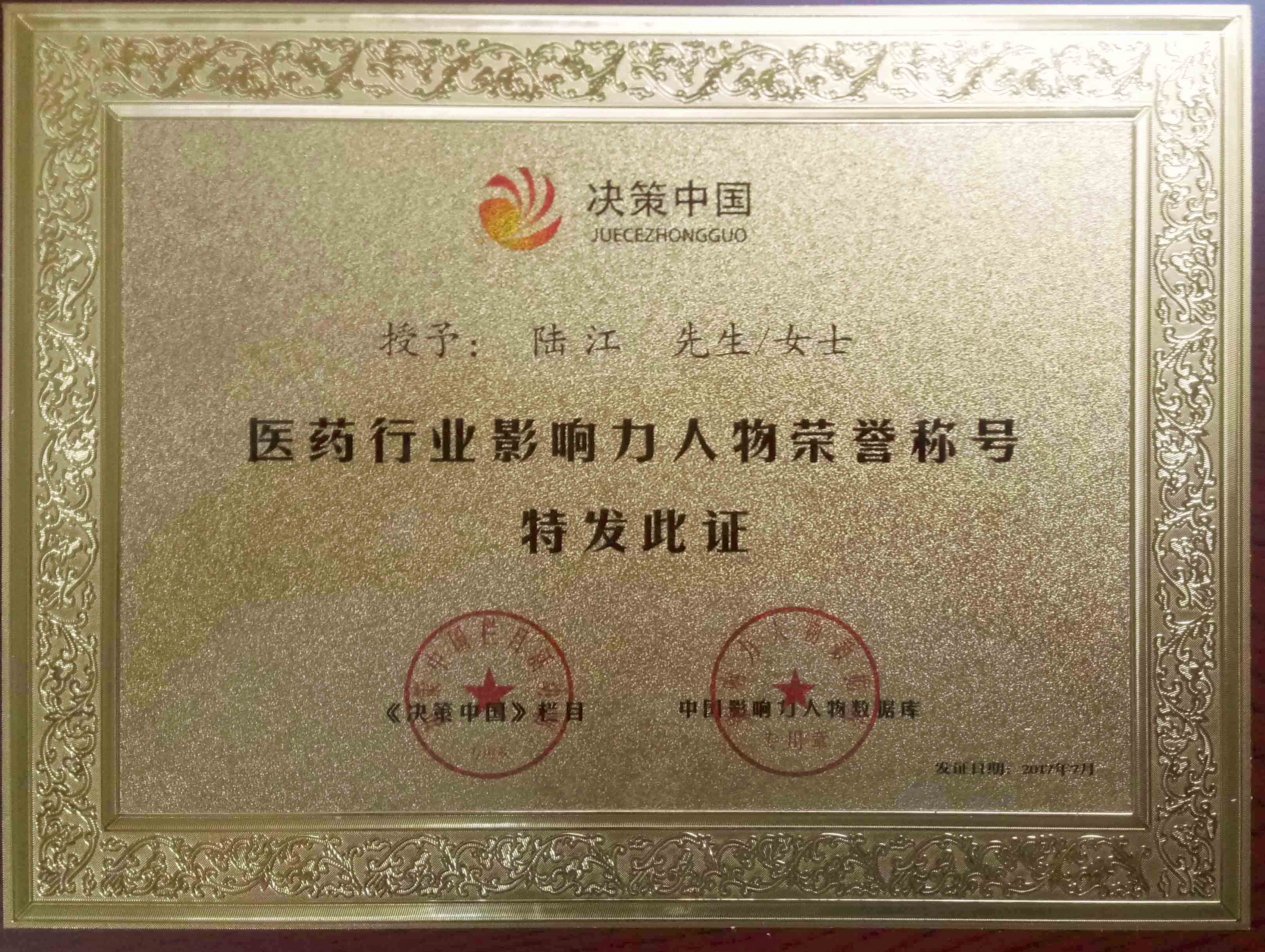 陸江榮獲醫藥行業影響人物證書